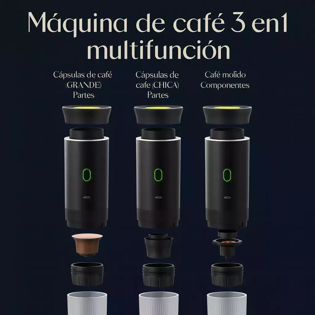 Tres formatos en uno → cápsula grande, cápsula pequeña o café molido.